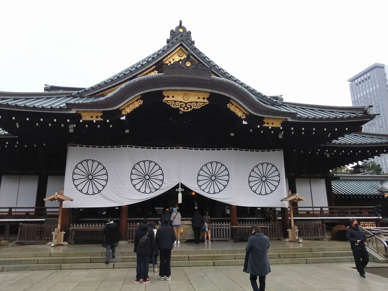 昨日からの雨がしとしと降っており通り沿いのカフェで休憩していたら、防衛大学の生徒さんが制服姿で参拝していました。