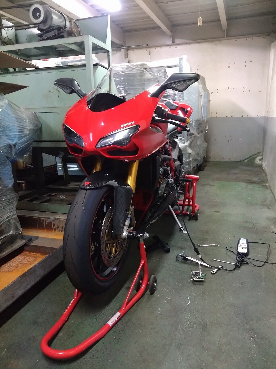 ピットにて充電の過程でセルを回したらバッテリーが弱っていたのでエンジンかからず最後に生ガスに着火してパーン!!!ってアフターファイヤーしちゃいました(;´Д`)