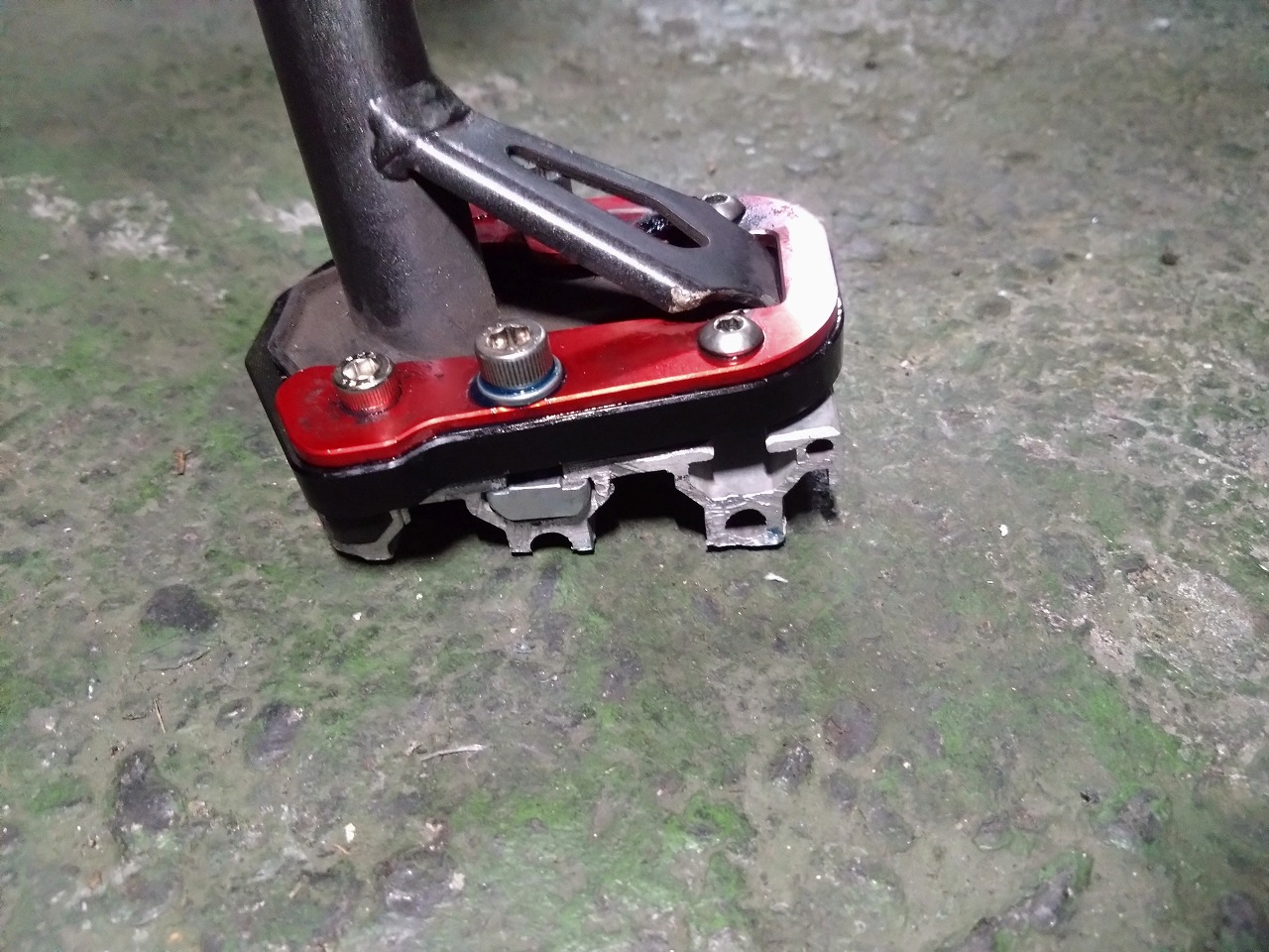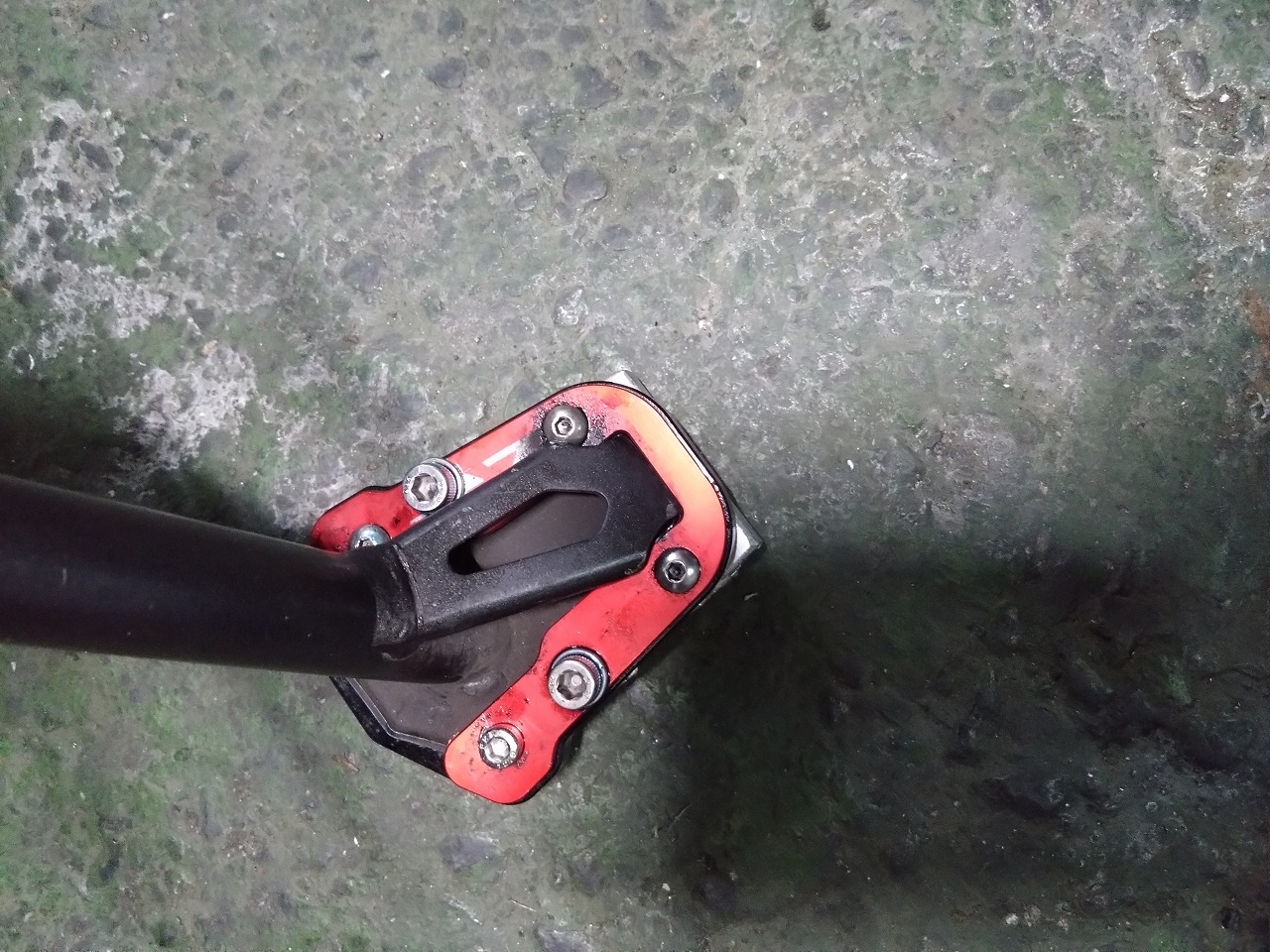 ついで整備が終わってからCRFを押していたらなんかカタカタいうので確認したら半自作のサイドスタンド延長パッド(サイドスタンド エクステンションパッド)のボルトが緩んでいました(´Д`;)