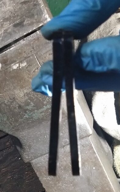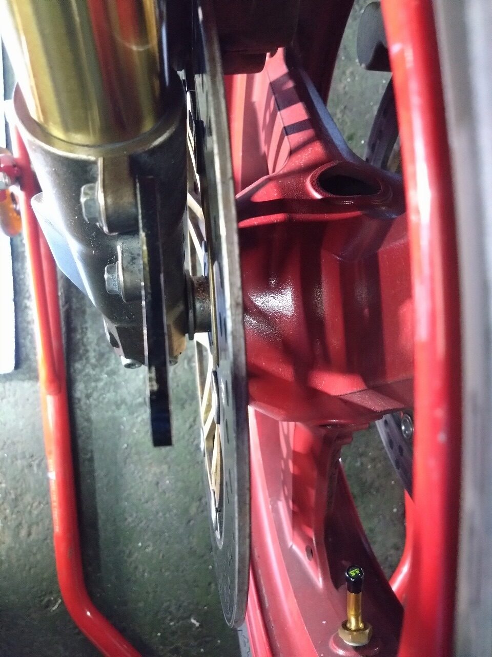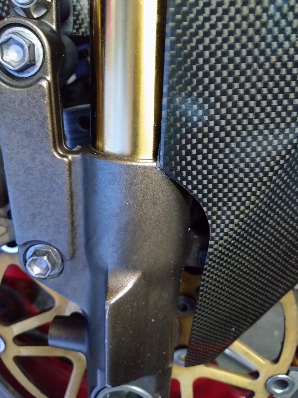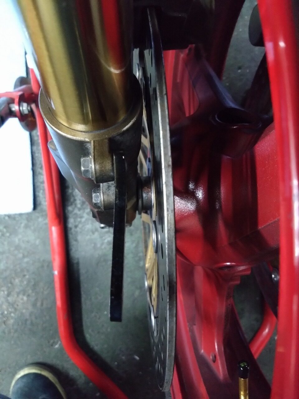 フェンダーのフォーク部分のプロテクターが内向きになってディスクとのクリアランスがあまりなくて干渉しそうなんです(;´Д`A ```
