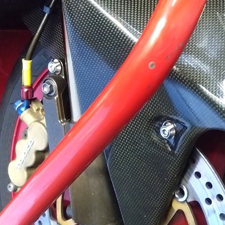 スタンドに立てた状態でフェンダーを挿入し、4本のボルトで固定してブレーキホースガイドを取り付けるだけなんですが、ここで問題発生。